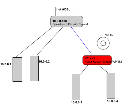 In mein Stern-Lan habe ich einen neuen Router eingebaut, der die Funktion eines AP hat. Zusätzlich will ich 2 weitere PCs am Router anschliessen.Problem: Wenn ich das blaue Kabel(normales Ethernet Kabel, nicht gekreuzt) in den Uplink vom Netgear stöpsle, kann ich mit dem PC 10.0.0.3 nicht aufs Inet zugreifen.