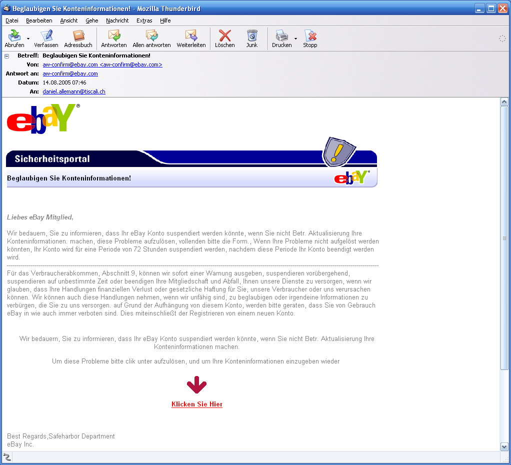 Ich hatte ne Mail im Postfach, angeblich von eBay. Es ist die erste Mail, bei der ich beim zweiten Blick noch nicht am Spam dachte. Dann beim Durchlesen merkte ich aber, dass etwas nicht stimmen kann:
