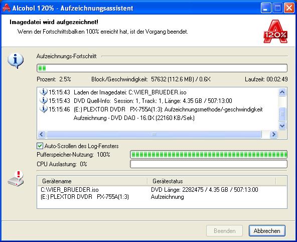 Der Brenner hat immer ungefähr 45' beim brennen von DVD-Movies, egal ob ich direkt mit CloneDVD brenne, oder zuerst das ISO mache und dieses anschliessend mit Alcohol brenne!