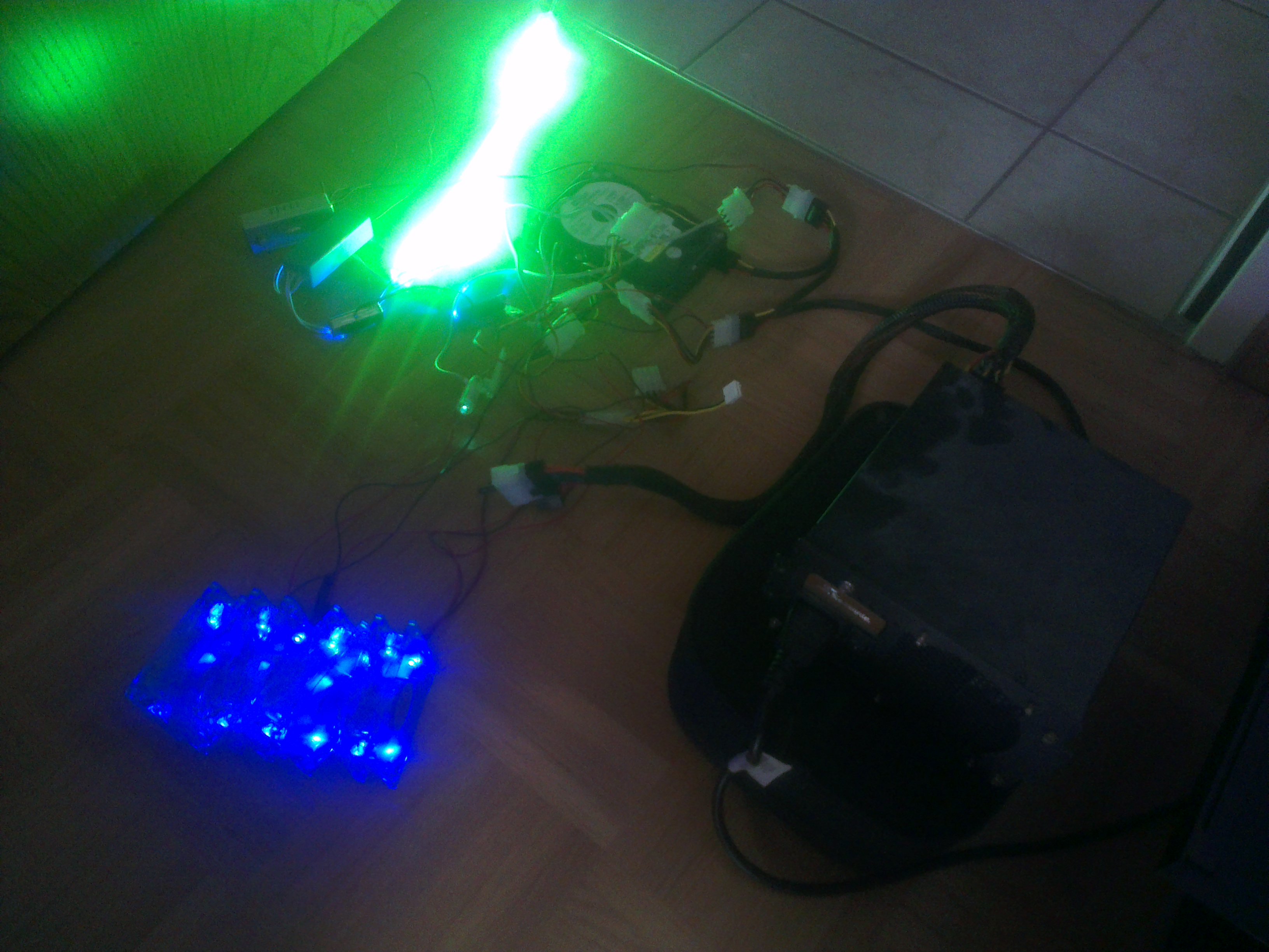 Merci für die Ratschläge. Habe nun mal mein altes Kaufmodding-Material wild drangehänkt; als die Kaltlichtkathoden auch noch dran waren (allerdings auf ON, nicht auf soundaktiv) funktionierte es dann tatsächlich