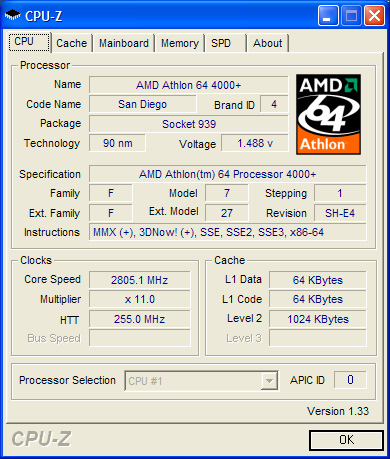 AMD Athlon 64 4000+ Boxed (2400MHz) @ 2800MHz mit standard vcore