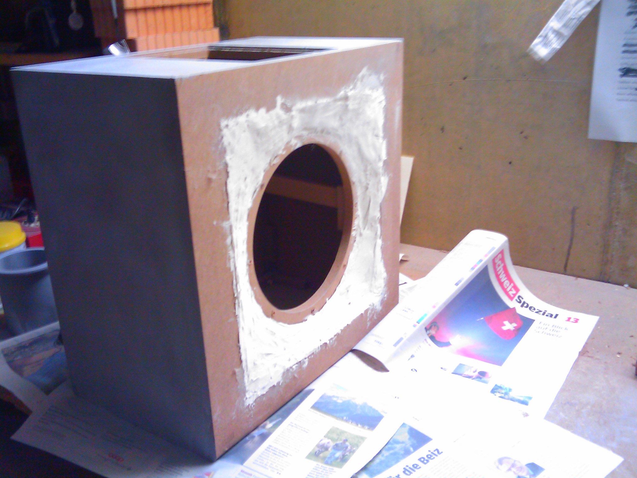 - heute hab` ich noch den Platz des Lautsprechers etws angepasst. Da ich gerne die Optik von "offenen" Lautsprechern habe (also ohne die abdecknetze, welche oft grann sind) habe ich den Absatz da ausgespachtelt und schleife den wohl morgen wenns ausgehärtet ist.