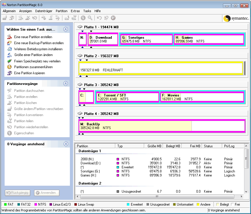 Im norton PartitionMagic zeigt es mir an das die Platte 2 (160GB) Fehlerhaft sei. Wenn ich diese nun Formatiere krieg ich die meldung, dass ich neustarten soll. Wenn ich nun neustarte für PartitionMagic die geforderte operation aus. Jedoch kommt es dann zu einer fehlermeldung (konnte batch datei nicht laden, fehler 4, oder so).