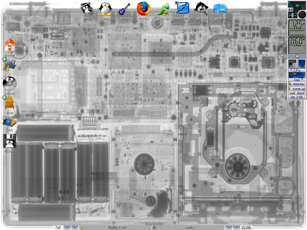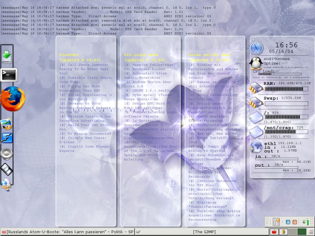ich benutze nun einen anderen WindowManager (xfce4), habe ein osX-like Panel, RSS-Feeds auf dem Desktop, eine Systemanzeige, einen Tail des Syslogs, eine transparente Multi-Konsole (glaub nicht auf dem Screenshot drauf..)...-> hinweis: Schriften auf dem Desktop sind durch die JPG-Kompression unscharf geworden.