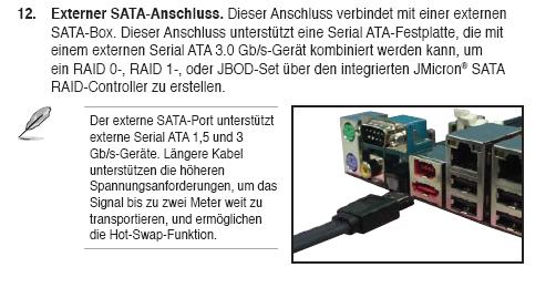 hab eine im schwarzen "SATA-RAID" und der andere muss der nach aussen verlegt werden? das heisst eine platte in den schwarzen internen anschluss wo SATA-RAID steht und eine platte in den eSATA anschluss an der ATX Blende. zum glück hab ich ein esata kabel, das geht zwar in den anschluss bei der ATX-Blende aber net in die HD.