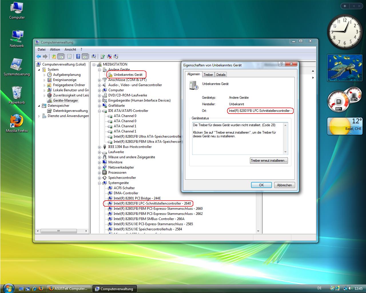 Im Geräte-Manager zeigt es mir ein "Unbekannstes Gerät" an. wenn ich auf "Eigenschaften" gehen seh ich das es Intel(R) 82801FB LPC-Schnittstellencontroller - 2640 ist.