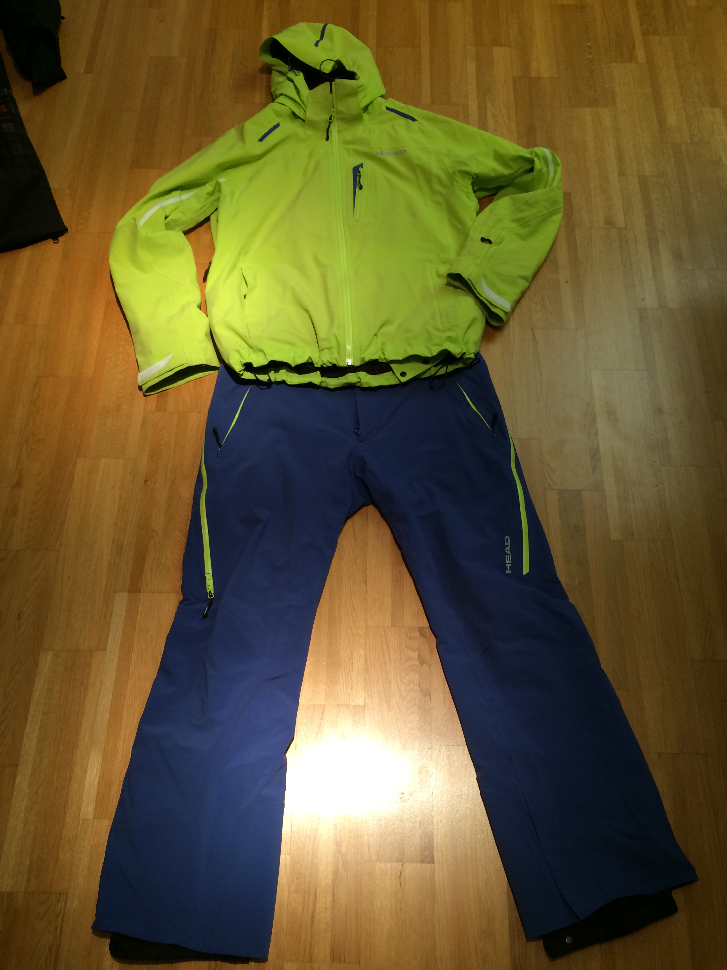 Der Head Skianzug besteht aus einer blauen Hose (zwei Taschen auf der Hüfte; Lüftungsschlitze aussen am Bein) und einer hellgrünen Jacke (zwei Seitentaschen, eine Brust aussen, zwei Brust innen; Lüftung unter den Armen). Sehr leichtes und angenehmes Material. Beides ist in der Grösse L (ich bin 1.88cm und 82kg).