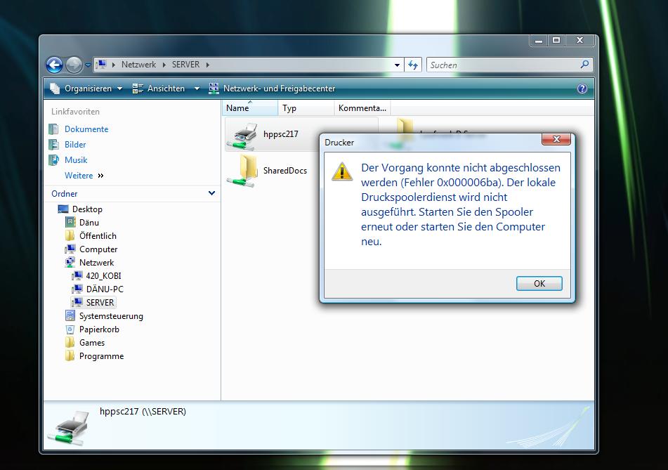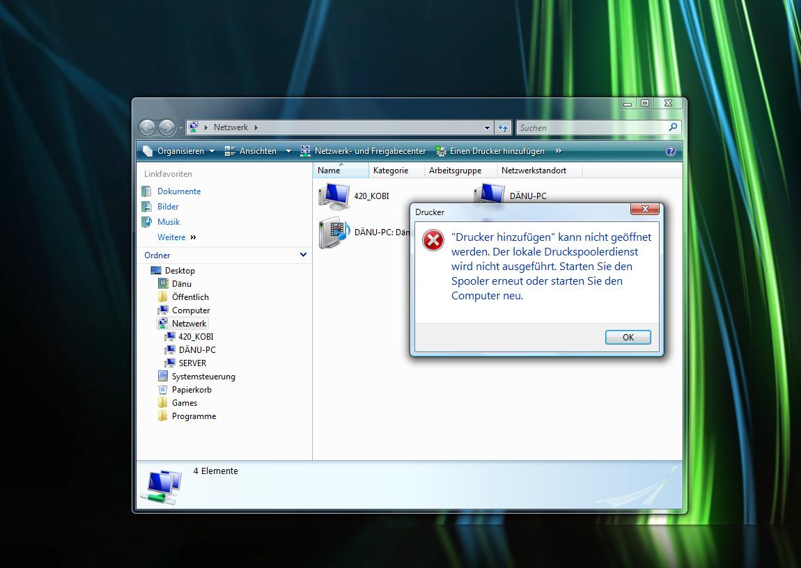 Ich habe ein Problem mit meinem zweiten Vista PC. Ich kann meinen Freigegeben Drucker auf meinem neuem Vista PC nicht hinzufügen, weil Vista ein Problem mit dem Spooler Dienst hat.