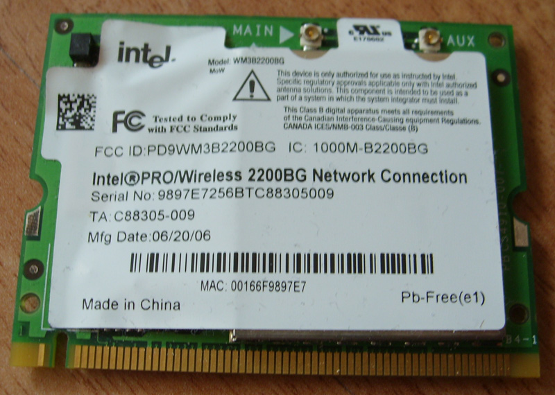 WiFi-Modul: IntelPRO Wireless 2200BG, 802.11b/g, mini-PCI, 10.- exkl