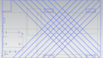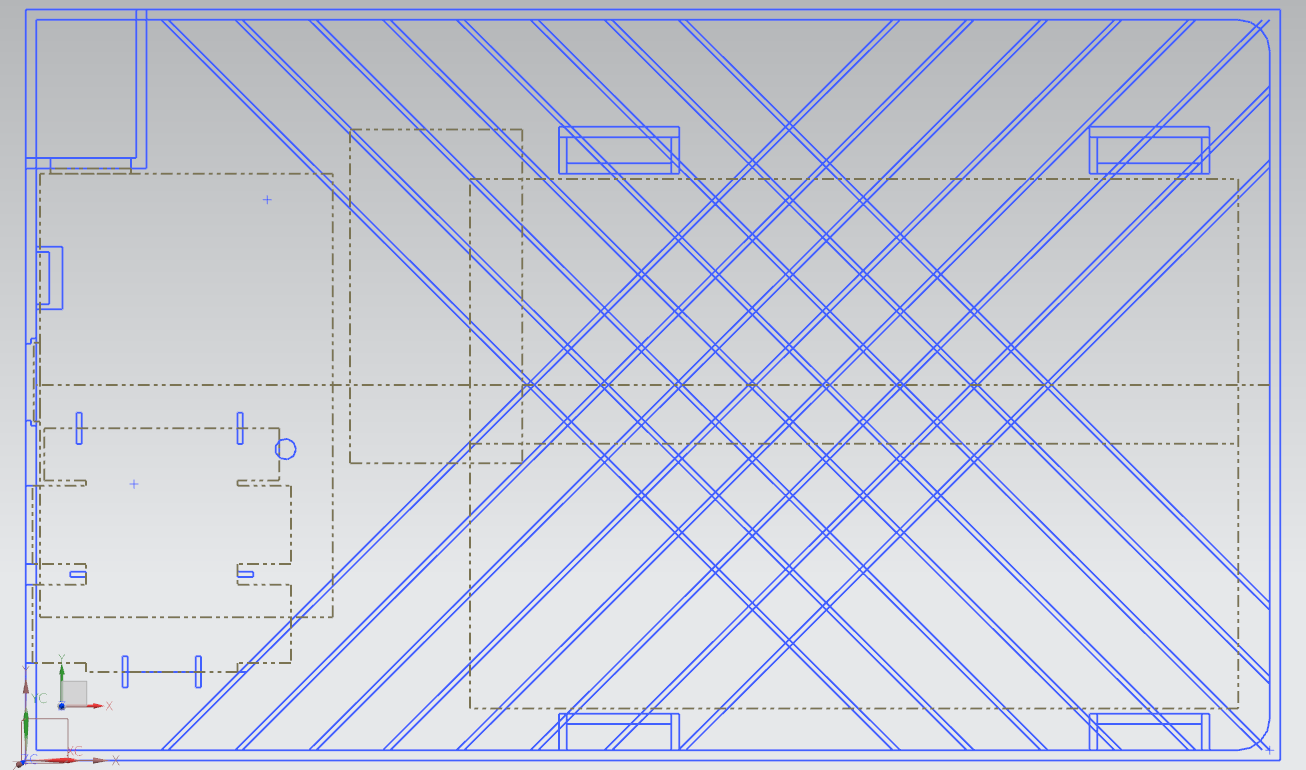 Festplatte und USB Hub seziert und ausgemessen und im CAD ein gehäuse für alle drei Komponenten entworfen (Die gepunkteten Linien repräsentieren die HD, den HUB und das PI).