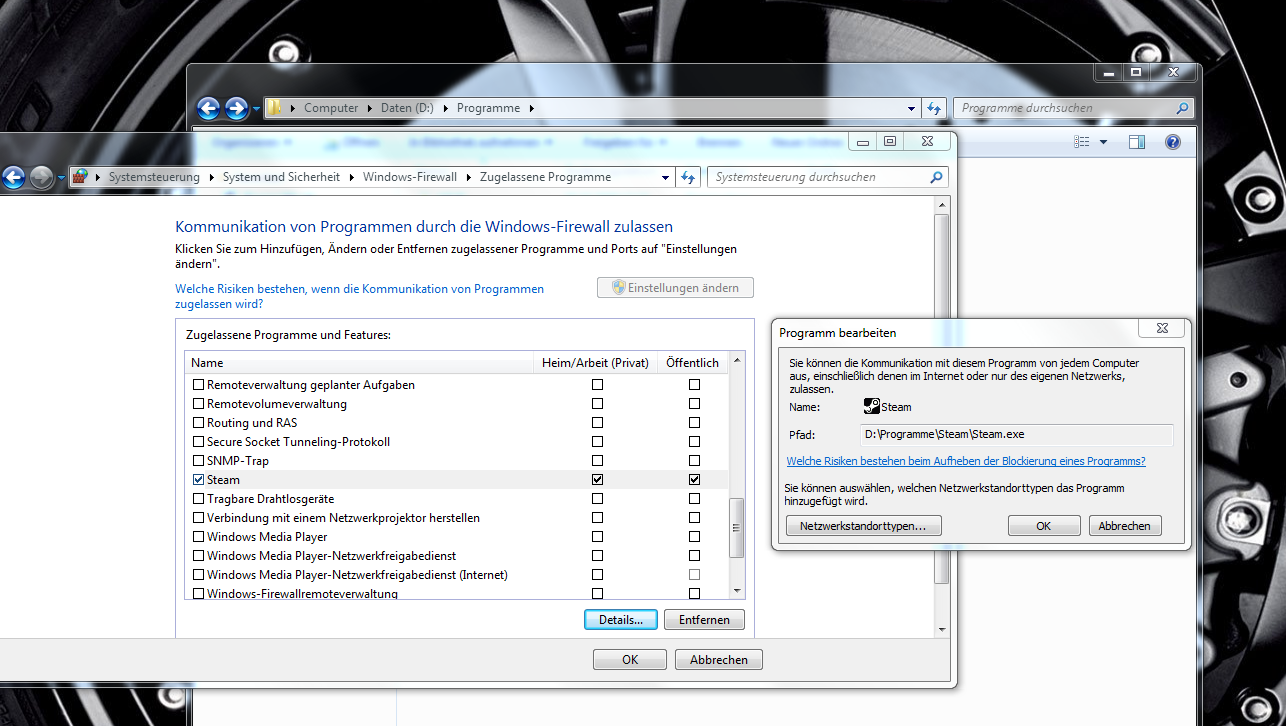Ich habe die Windows Firewall aktiviert, Steam sollte jedoch darüber kommunizieren können... Siehe Bild im Anhang.