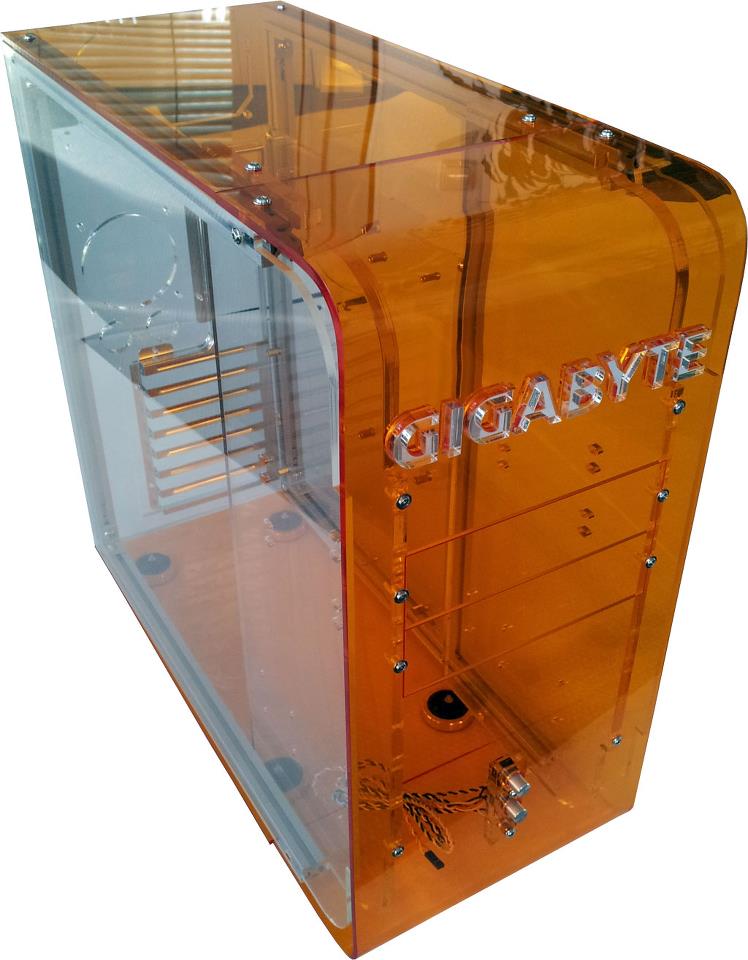 Auf gepasst, diese Case kann man nicht kaufen! Es ist komplett aus Orangen Plexiglas und Alu Gestell. Ein Prestige Case aus dem Hause GIGABYTE!