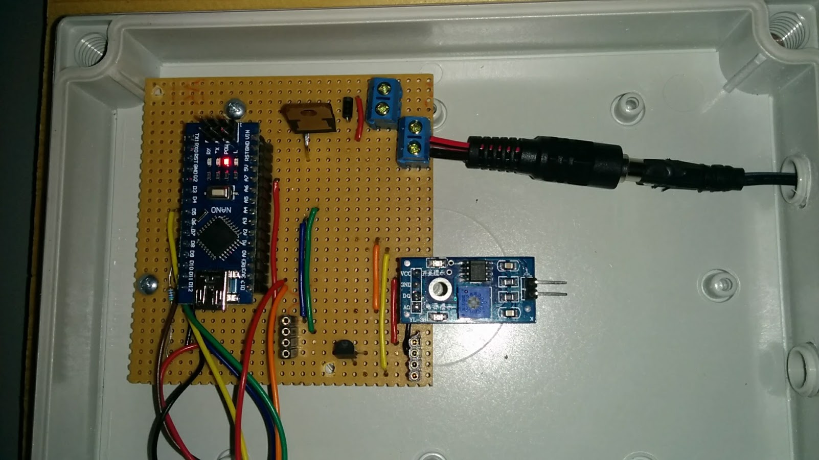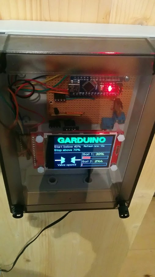 Ein 12V Netzteil speist den Arduino über den RAW Eingang. Der Digitale Pin8 schaltet ein Hochleistungstransistor (TO Bauteil auf dem Bild) mit 12V vom Netzteil für das Ventil. Eine Diode fängt die Rückspannungensspitzen ab, welche beim Schliessen des Ventils entstehen könnten (Magnet)Die Feuchtigkeitssensoren laufen mit 5V vom Arduino. Der TFT ist mit 3.3V betrieben. Da habe ich ein L78L33 und einen CD4050 Logic-Shifter, um die Datenpins ebenfalls von 5V auf 3.3V zu bringen.