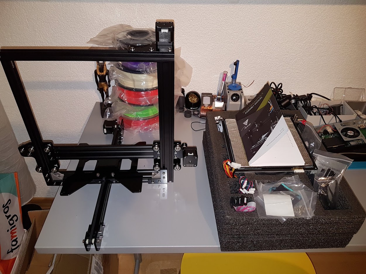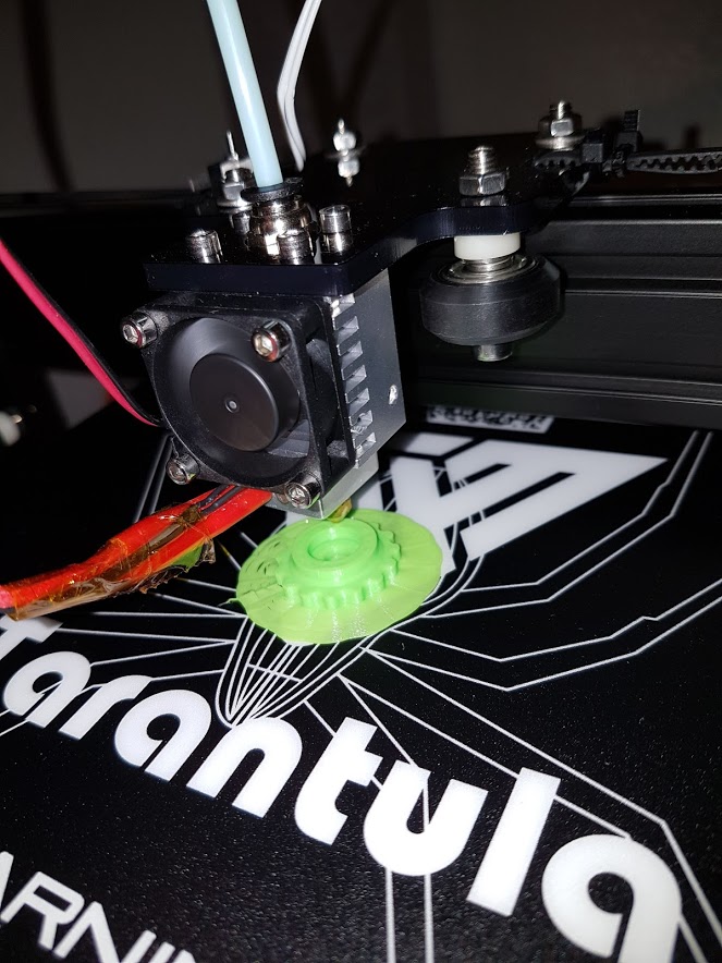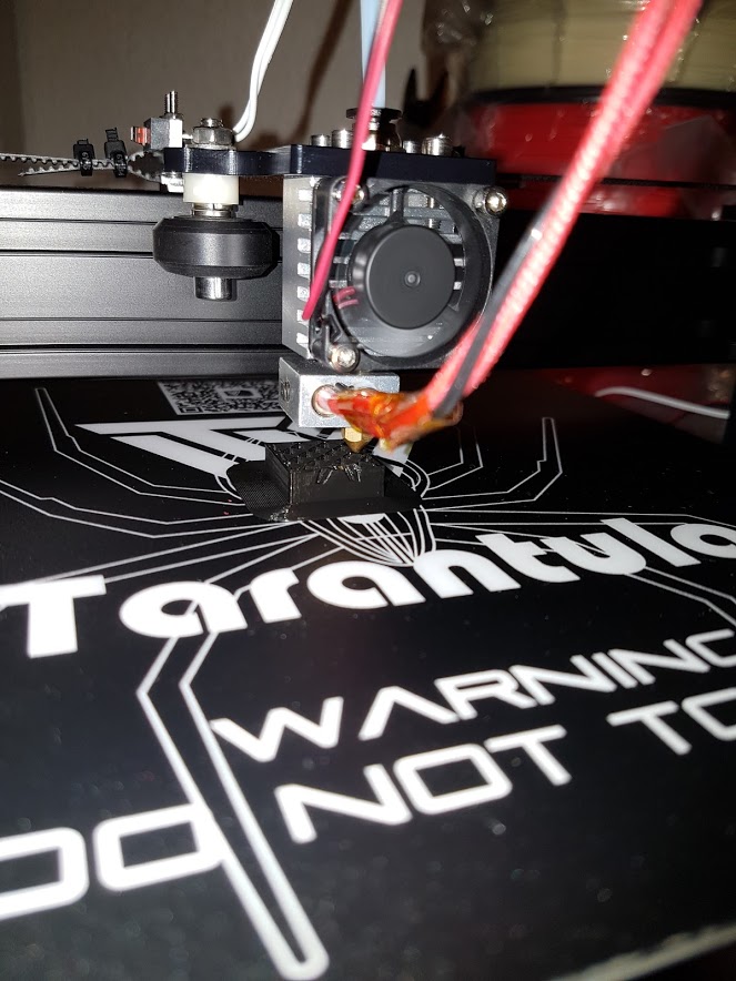 Nachdem ich den Tarantula in 3 Std. zusammengbaut habe, hab ich mal die Axis getestet und sichergestellt, dass die endstops funktionierten. Alles lief wunderbar. Dann hab ich die neueste Marlin (2.0) hochgeladen mit der optimierten Tarantula config (https://github.com/JimBrown/MarlinTarantula).