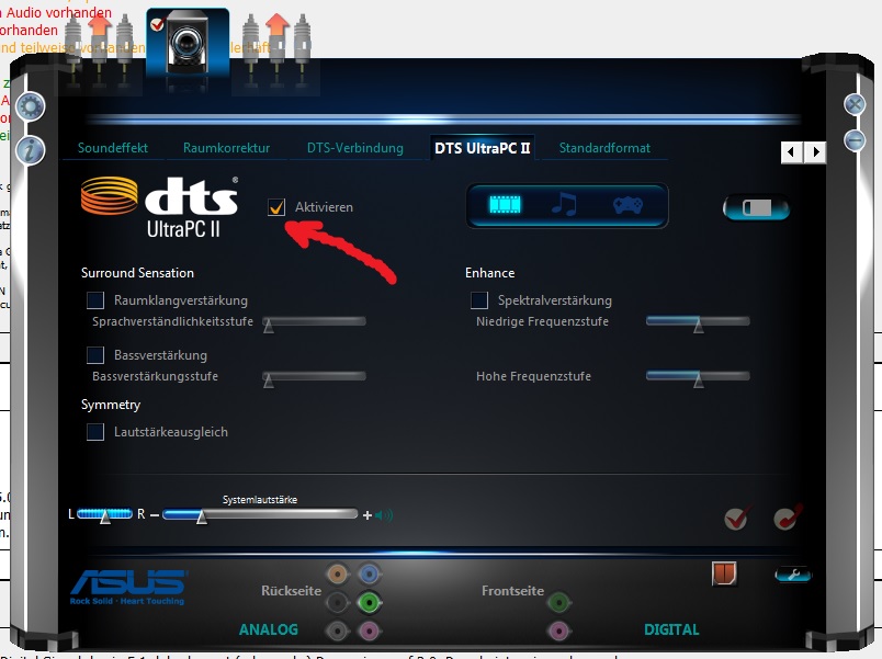 ZitatRealtek® ALC 898 8-channel High Definition Audio CODEC- Supports 192kHz/ 24bit BD Lossless Sound- DTS Surround Sensation UltraPC II- Supports Jack-Detection, Multi-Streaming, and Front Panel Jack-Retasking- Optical S/PDIF Out port at back I/ODTS UltraPC IIDTS UltraPC II delivers exceptional 7.1 surround through the most popular PC audio setups - your existing stereo speakers or headphones. In addition to virtual surround, it upgrades original sound to new levels with Audio Restoration, recreating the dynamic range of audio files. Symmetry mode improves the balance of perceived loudness across different input sources and Enhance boosts audio quality through high and low frequency equalization. With these technologies, users experience better home theater audio with ease.DTS ConnectTo get the most out of your audio entertainment across all formats and quality levels, DTS Connect combines two enabling technologies. DTS Neo: PC™ upmixes stereo sources (CDs, MP3s, WMAs, internet radio) into as many as 7.1 channels of incredible surround sound. Consumers can then connect their PC to a home theater system.DTS Interactive is capable of performing multi-channel encoding of DTS bitstreams on personal computers, and sending encoded bitstreams out of a digital audio connection (such as S/PDIF or HDMI) designed to deliver audio to an external decoder.