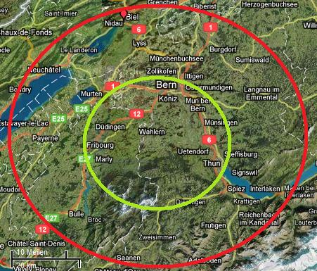 1. Skoal sagte 3 Städtenamen: Thun, Bern und Fribourg. dadurch musste ich annehmen, dass er lieber ins Unterland als ins Oberland fährt und habe den grünen Kreis absichtlich so gesetzt, dass sein Wohnort NICHT im Zentrum ist (den hab ich ja schliesslich mitm Häuschen-Symbol überprüft). das Wort Radius war wohl falsch gewählt, ok.