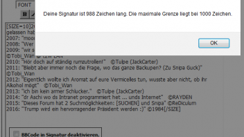 Nachdem ich vor paar Jahren schon 1x Fettdruck pro Zeile und 1x kursiver Text pro Zeile aufgeben musste, habe ich mittlerweile schon soooo viel Forencodes aus meiner Sig rausgenommen, dass praktisch nur noch reiner Text ist. Es hat keinen Platz mehr für neue Zitate