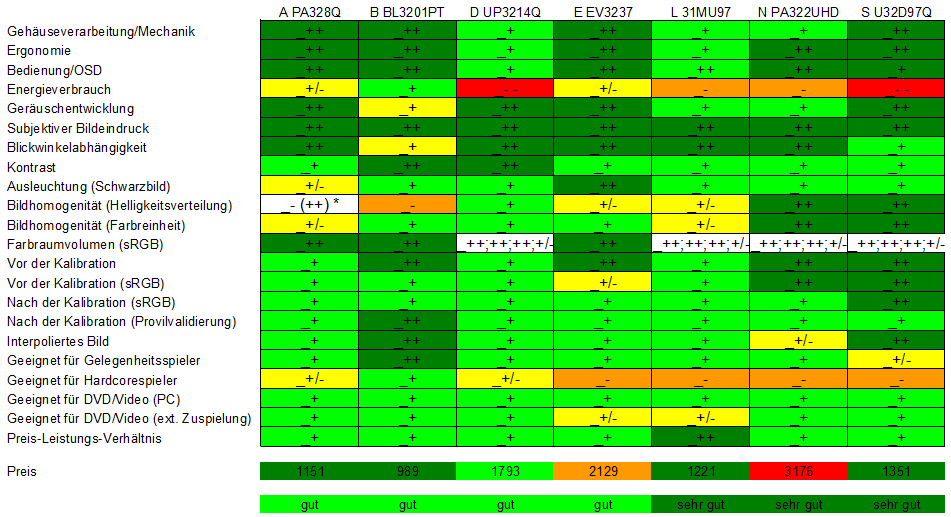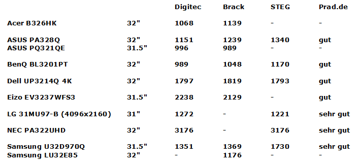 Vielleicht hilft es ja sonst noch jemandem bei einer Entscheidung. Keine Garantie auf Korrektheit und Aktualität, was Preise und Wertungen betrifft. Könnte durchaus noch einen Fehler übersehen haben beim Abtippen der Wertungen von Prad. Die Tabelle habe ich schon vor paar Tagen erstellt. Displays unter 30" habe ich nicht berücksichtigt. 40" kommt nur dann in die Auswahl, wenn ich die Höhe und den Winkel verstellen kann.