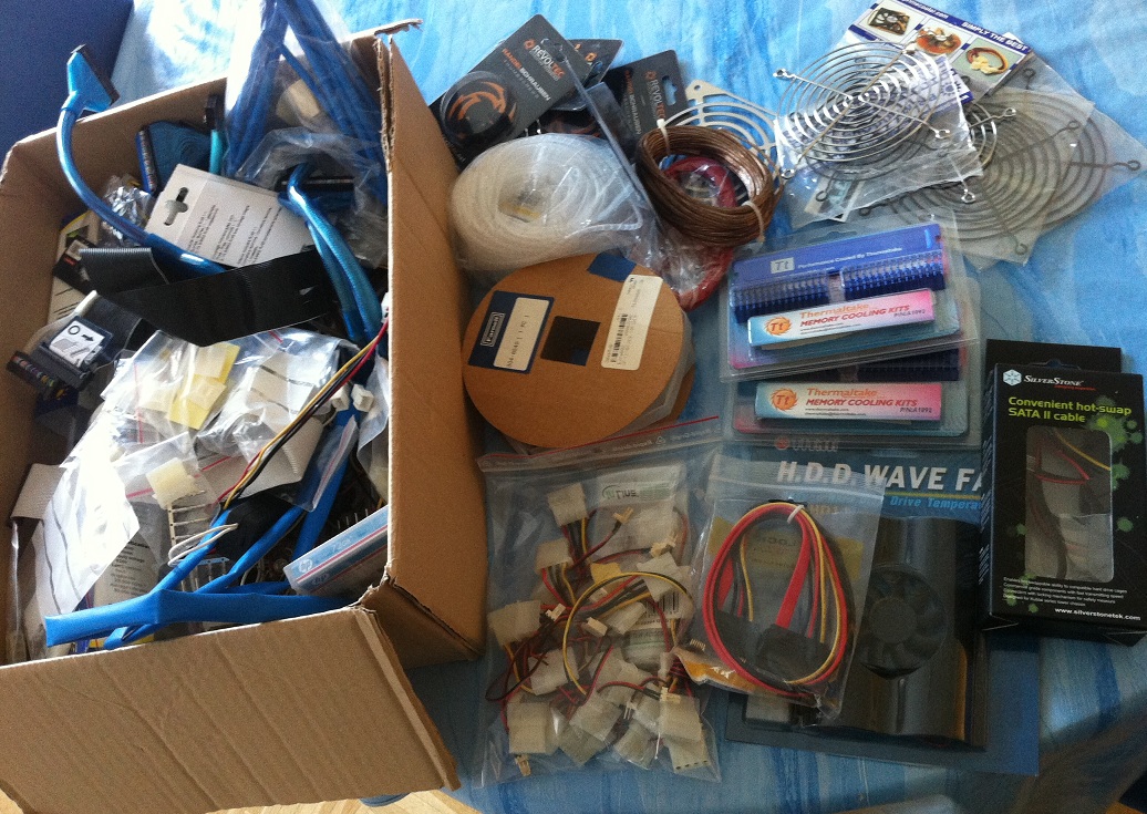wenn Fragen sind, einfach fragen. hat viel Molex 4pin Zeug dabei, Molex 3pin, Schrumpfschlauch, Spiralschlauch, paar LEDs, Widerstände, Kabel, Litzen, IDE-Kabel, Lüftergitter, paar UV-Kaltlichtkathoden (unverpackt)