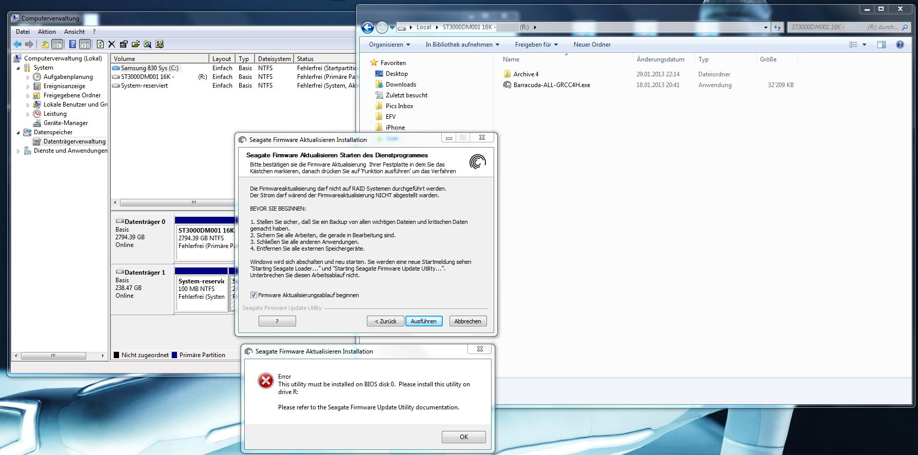 seit Dezember hab ich paarmal versucht, die "schlechte/schädliche" Firmware meiner ST3000DM001 (3TB, 3x1TB Platter) zu aktualisieren, damit meine Platte nicht irgendwann mal abkratzt. danke ruffy91