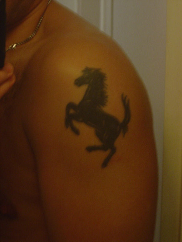 Ich hab ein ca. 12cm grosses Ferrari-Pferdchen auf dem linken Oberarm....