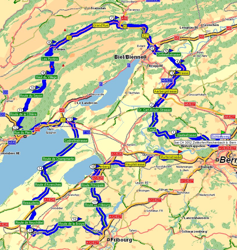 bern - aarberg - lyss - biel - sonceboz - st imier - le pâquier - richtung neuenburg - gampelen - chabrey - payerne - belfaux - murten - mühleberg - frauenkappelen
