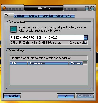Ich habe aber das Problem, dass der Rivatuner meinen Treiber gar nicht kennt!?Hab nun den Catalyst 4.3 drauf, n' älterer ging auch nicht, Omega und DNA auch net.