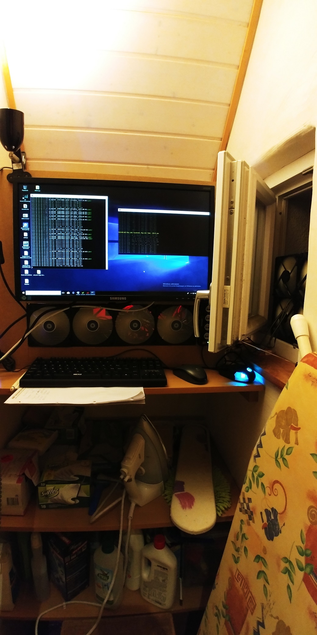 Lüfter: 8x 120mm Arctic direkt an 12V, Vier davon am FensterDarauf Läuft Windows 10, Registry Softmod auf den Vega Karten um den Stromverbrauch zu optimieren.