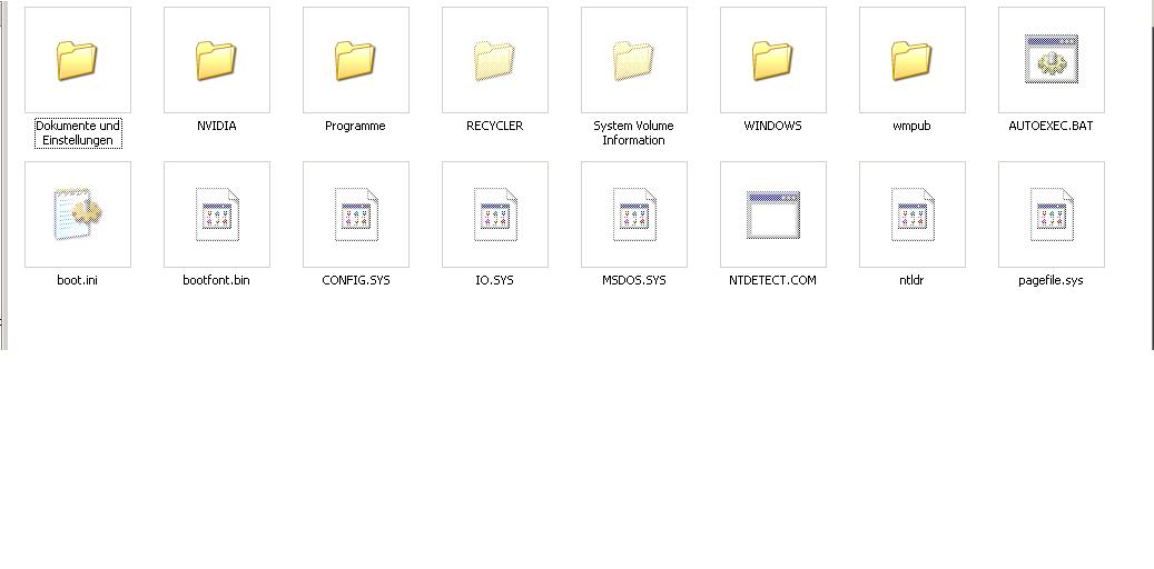 Sobald ich ihm Windows Explorer auf mein C: Laufwerk klicke ( in der linken Spalte) komme ich auf die unten angehängte Ansicht. Kaum bin ich aber auf dem C: Laufwerk und sehe die folgende Ansicht, stürzt der Explorer ab und startet sich neu. Hatte ein solches Problem auch schon einmal, aber damals war es eine Datei, die das verursachte. Nur welche ist es diesmal oder gibt es eine andere Lösung? VirenScaner und Ad-Aware sind alle up to date.