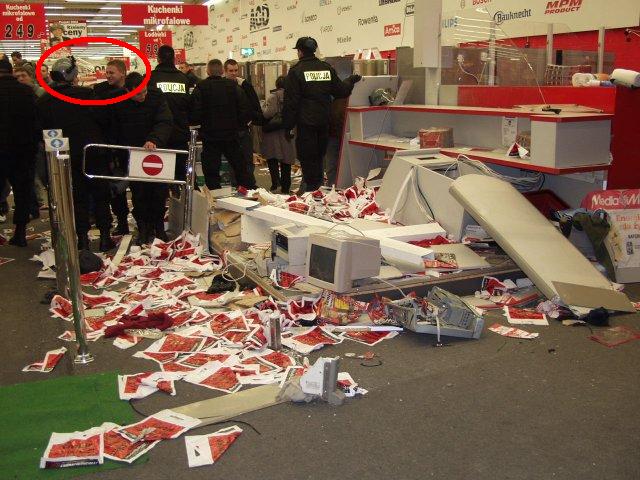 solae: was ist den an dem Bild so Speziell?? das ist ein Polnischer Polizist mit Anti-Demo-Beckleidung..naja der eine grinst dem bullen voll ins gesicht