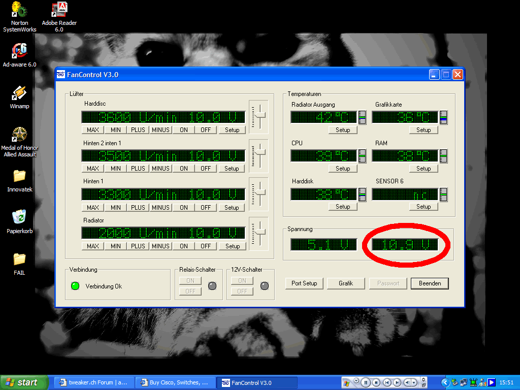 also, habe die innovatek Fan-O-Matic und dort zeigt es mir bei der 12Volt Leitung nur 10-11.5 Volt an.