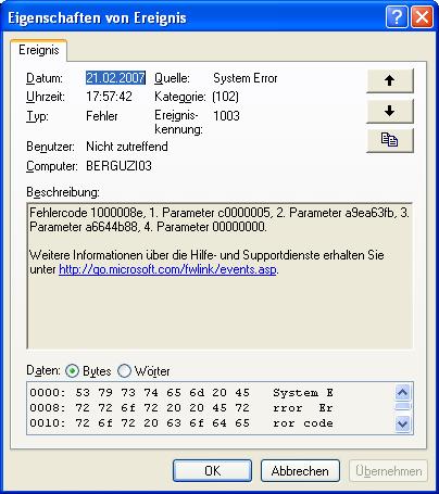 Habe noch folgendes in der Ereignisanzeige gefunden: